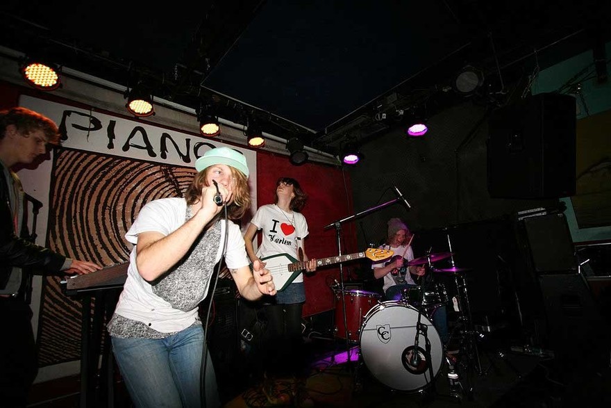 Pig Out performing. Kit Lawrence on the speaker, Fraser Austin on bass, Marie Celeste on synths, Nick Harte (seated) on drums. - James Dann