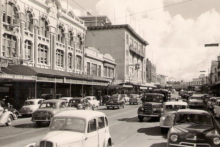 Karangahape Road in the late 1950s shows three department stores in a row, all with thriving record shops: Rendells, McKenzies and George Courts
