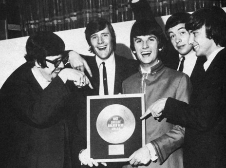 Mr Lee Grant with his 1967 Golden Disc, surrounded by runners-up The Avengers. The black and white image doesn't do justice to Mr Lee's scarlet tunic. His acceptance was "I owe this award to all who voted for me – it's thanks to you." - Photo by Barry Clothier; Simon Grigg collection