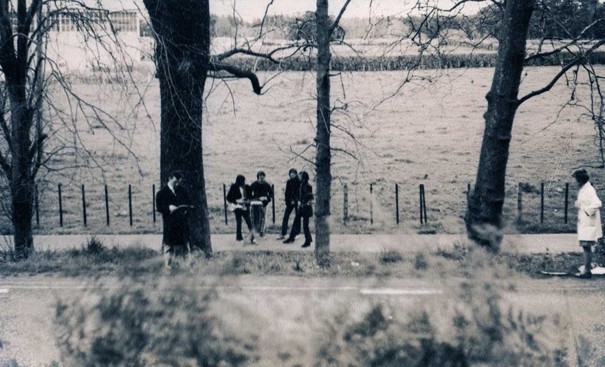 The Underdogs filming the video for 'Sitting In The Rain' outside Palmerston North, 1967. Director Christopher Bourn is seen on the left. (The cameraman was Peter Boden.) - Christopher Bourn collection