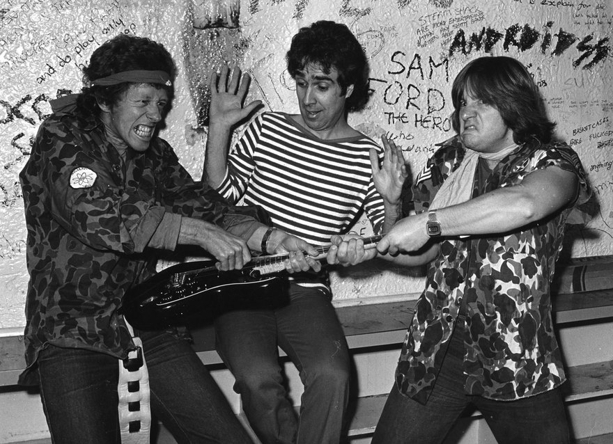 Ian Morris and Peter Urlich on fire at Mainstreet, circa late 1979; at right is bassist Lez White. - Murray Cammick