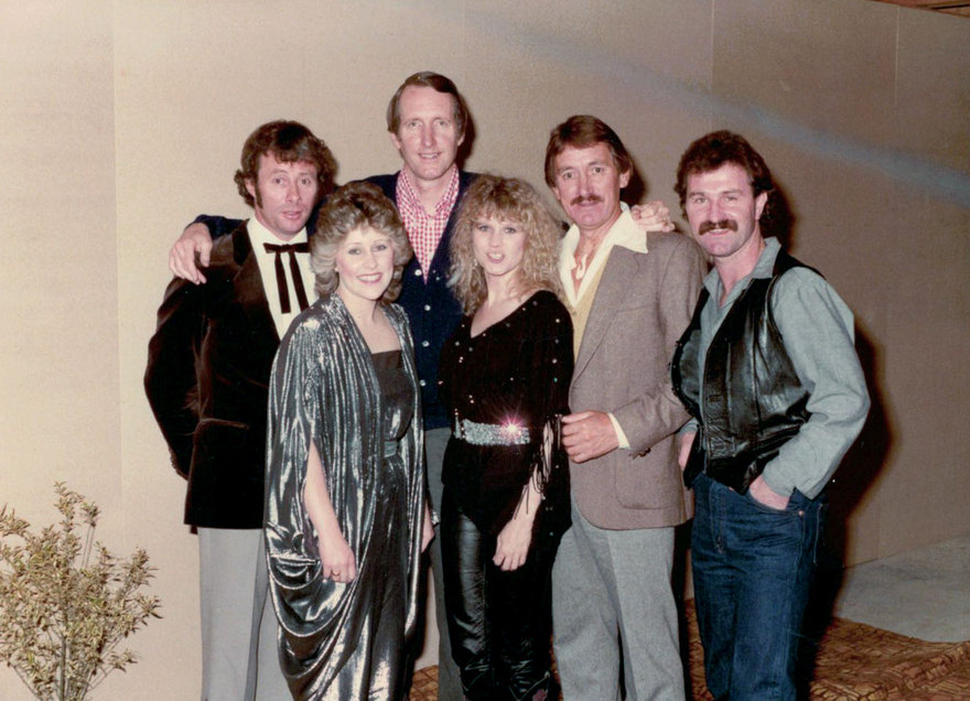 Gold Guitar Awards in Gore, mid-1980s. Left to right, Noel Burns, Suzanne Prentice, George Hamilton IV, Oklahoma singer-songwriter Becky Hobbs, Paul Walden, Michael Roycroft. Hobbs sang a duet with Roycroft on the 1985 album Slow Burnin’. - Michael Roycroft collection