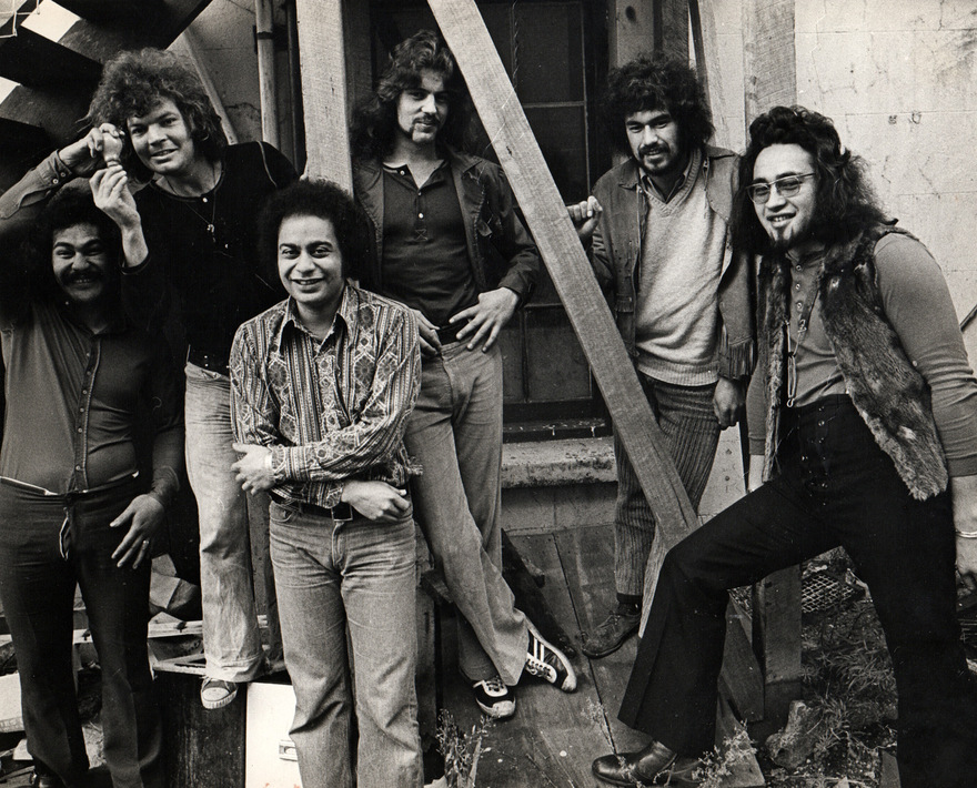 Arkastra in Wellington behind Lucifers nightclub, just off Manners Street. L to R: Harry Leki, Andy Anderson, Tom Swainson, Peter Blake, Paul Reid and Dennis Mason. - Andy Anderson collection