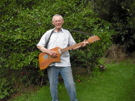 81-year-old Rudy Spemann in 2015 with the guitar he built when Rudy & The Crystals formed with three guitarists and only two guitars. Without the means to buy another, Spemann built this one.
