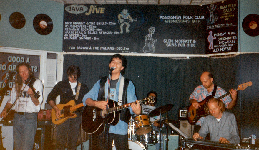That was the situation when I first set foot in the place in the middle of 1992. Six months after moving up from Napier I’d met guitarist Rob Galley who invited me to the Java’s new Sunday night country jam when the planned singer/host had opted out. Alongside Galley, the band included Jono Lonie on fiddle, Murray Pomare on drums and Paul Walker himself on bass.