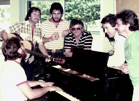 Brendan Dugan and Gray Bartlett participate in an impromptu sing at the Nashville ASCAP offices, early 1980s.