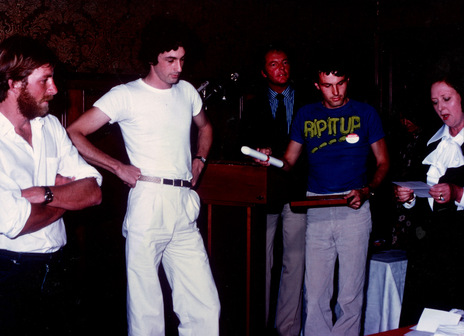 Citizen Band is awarded Most Promising Group at the 1978 RATA Music Awards at the White Heron, Parnell, Auckland, by artist Shona McFarlane with WEA Records' Tim Murdoch looking on
