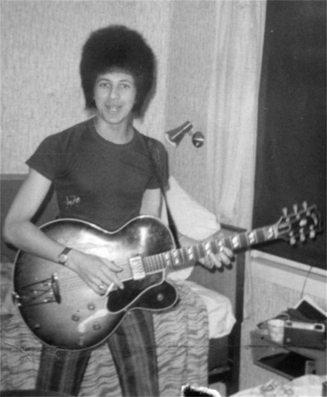 Evan Silva with Mike Wilson's guitar in the Plaza Hotel, Sydney