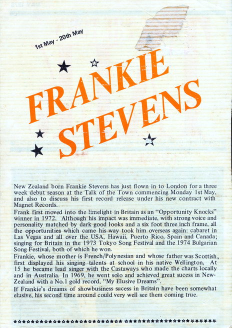 In 1966, at the age of 16, Frankie Stevens left Upper Hutt behind and joined expat group Peter Nelson and The Castaways in Sydney. Four years later Stevens moved to London, where he released 12 singles during the 1970s and performed in the UK, Europe, Las Vegas, Hawaii and Canada.