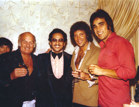 Taken in Frankie Stevens' dressing room at the Royal Hawaiian Hotel in 1979, (L to R) Charles Mather (Frankie Stevens' manager), Coronado Aquino (Maître D, Monarch Room), Tom Jones and Frankie Stevens.