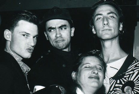 Headless Chickens: Bevan Sweeney, Grant Fell, Rupert E. Taylor, Chris Matthews, Michael Lawry, in a shot taken in 1988, before Fiona and Anthony joined. It was used on the cover of Rip It Up when the Stunt Clown album was released.
