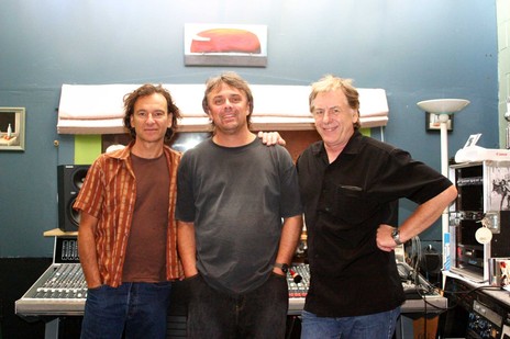 Hammond Gamble with Mike Caen and Rikki Morris at Rikki's studio The Bus in 2006 whilst recording Hammond's Recollection