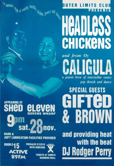 The Headless Chickens at Wellington's Shed Eleven, 1992, with Australia's Caligula, local heroes Gifted & Brown, and DJ Roger Perry