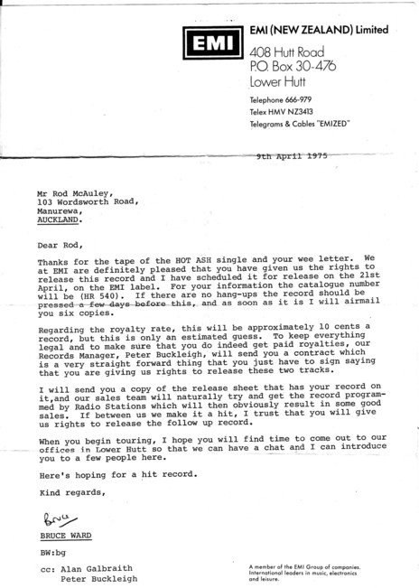 Before long a friend of the band encouraged Kontact Records owner and promoter Dave McKee to have a look at this new act. An interview was set up at the White Horse Inn at Pakuranga and McKee signed Hot Ash.