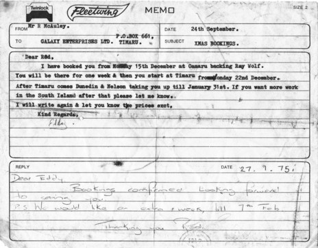 On occasion, Rod and Pauline’s three daughters would join the band on the road, as well as Pauline’s brother Peter Howearth, who would babysit. Luckily the children weren’t with them for one trip south when their clapped-out Holden hit an icy patch near Tokoroa and rolled. A helpful forest worker in a four-wheel drive righted the car, Rod popped the dented roof out and they continued on their journey, gigging that night.
