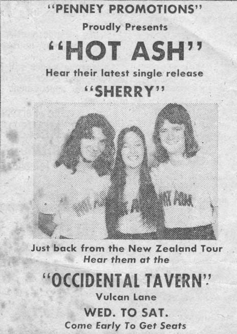 That February, Hot Ash took part in the Auckland Festival’s Rock Marathon competition and were one of only two bands that did their own material. The other, Dragon, won top prize although their singer Marc Hunter revealed he thought Hot Ash should have. The runners-up were a blues covers band called Drut (apparently so named as it was ‘turd’ spelled backwards).