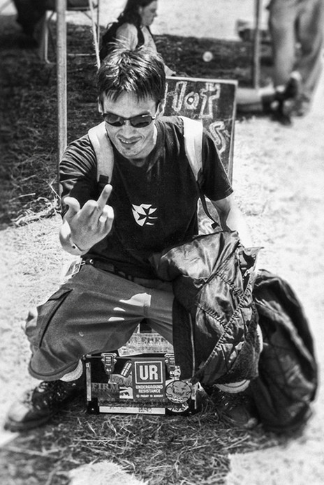 Clinton played most of those big raves, and I began going to his then regular Thursday club night ‘Juice’, which consistently reeked of Amyl Nitrate. Day or night when I saw him he knew how to play up his moniker well. He knew that I wanted to be doing what he was doing, and I’d either get the ‘fuck off’ stare when I tried to watch him on the decks at night, or the ‘fuck off’ stare when I saw him in his massive black jacket with record bag slung over his shoulders during the day. But as I myself got more involved with Radio Active and began getting gigs of my own, I began to get to know Jason, rather than Clinton.
