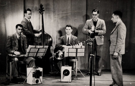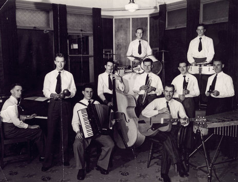 Bill Hoffmeister – an urbane, charismatic multi-instrumentalist – was a Wellington music identity for decades. In the back row of his 2YA radio band in the early 1950s can be seen Jim Carter on guitar, Doug Brewer on bass and Vern Clare on trumpet and drums.