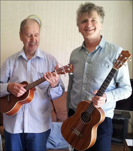 Jim Carter with Neil Finn (right), after recording a new version of Blue Smoke in his Nelson living room, 13 February 2015