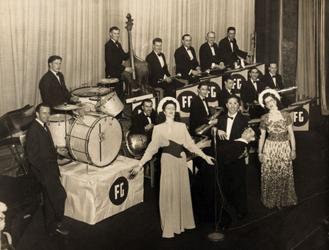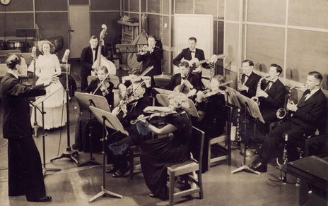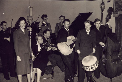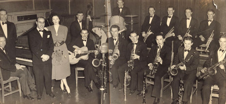 Fred Gore's 2YA Orchestra in the Wellington NZBS studio, c1946. Beside Gore is the expatriate American singer Marion Waite, who married a New Zealand pilot. Bill Hoffmeister is at the piano, behind him is radio host Burton Chadwick. Also identifiable are, from left: Jim Carter guitar, Doug Brewer bass, Vern Clare drums; on trumpets are Ray Smith, Stan Crisp, an unknown player and Dorsey Cameron. The saxophonists are, from left: unknown, Geoff Mechaelis, Eric Foley, unknown and Johnny Williams.