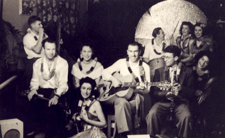 Pixie Williams (far right) with, from left, musicians Doug Brewer, Bill Hoffmeister, Jim Carter, Keith Willet and Russ Laurence. The women from the audience are unknown. Wellington, late 1940s.