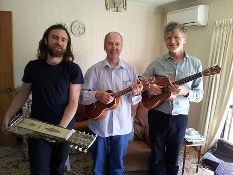 Liam Finn, Jim Carter with Neil Finn – Nelson, 13 February 2015. Liam, who engineered the Finn/Carter ‘Blue Smoke’ session, feels the weight of Carter’s lap-steel guitar, and is tempted to take up the instrument.