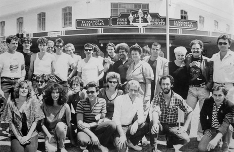 Assorted bands that trod the stage upstairs at The Gluepot, circa 1985. Amongst the faces are Hello Sailor, promoter Mike Corless, Beaver, Josie Rika, Hattie St. John, Hello Sailor's manager David Gapes, Rick Bryant, Trudi Green and Sam Ford of The Neighbours, Neil Edwards, Phyllis, booker Eddie Cook and Hammond Gamble.