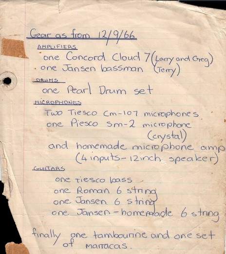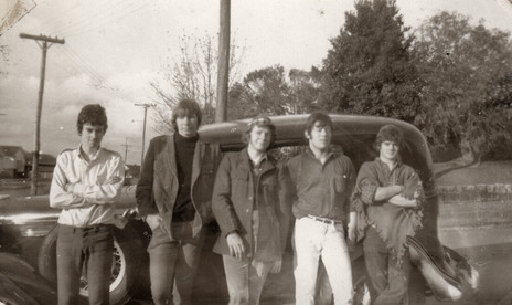 The Zarks outside their practice garage, Asquith Ave., Mt. Albert, Auckland 1967: Denis "Tub" Winters, Greg Sharples, John Morrell, Terry Bradley and Larry Killip