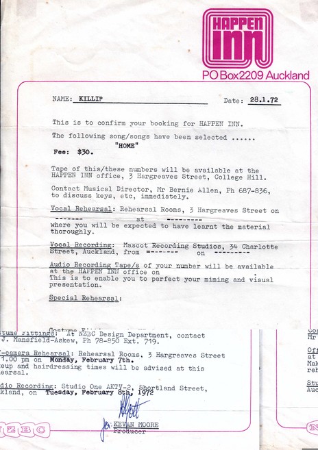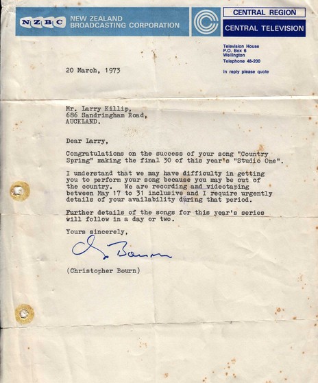 NZBC's Chris Bourne writes to Larry Killip about performing on Studio One in 1973