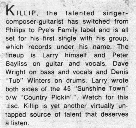 Country Pickin', Killip's debut single on Pye's Family label. The Larry Killip penned track would, without the band's knowledge, later appear on a K-Tel collection called 20 Town And Country Greats, alongside the likes of Johnny Cash and George Jones. Although it was a large seller neither the band nor the songwriter received a cent.