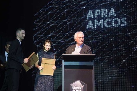 Joel Little and Ella Yelich-O’Connor (Lorde) receive the award for 'Royals' being the most-performed work overseas in 2013-2014, presented by Mike Chunn, former Apra NZ head of operations.