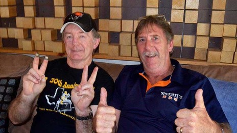 Noel Parlane (right) and his old mate pedal steel guitarist Paddy Long during the recording of Everybody’s Here in Brisbane in 2014
