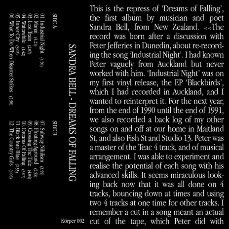 With Peter Jefferies on drums, David Mitchell on guitar, and Kathy Bull on bass, Sandra, who also played guitar and sang, re-cut 'Industrial Night' in 1990, and this song, along with a new piece, 'Lost Train', on which she played everything herself, were included on the Belgian released compilation Killing Capitalism With Kindness. The release was to prove pivotal to her development as a recording artist, and marked the beginning of her expansion into overseas markets. Issued by Turbulence Records, on both vinyl ( as a triple 12-inch boxed set), and CD in 1991, the songs went on to become the basis of a full-length album, the Xpressway released cassette Dreams of Falling. When Turbulence released the album on CD and LP the following year, it marked the first time a Sandra Bell collection had appeared in all three formats. Xpressway’s marketing of the cassette in the US had paved the way, and the Turbulence release sold well in both Europe and, as an import, in the US.