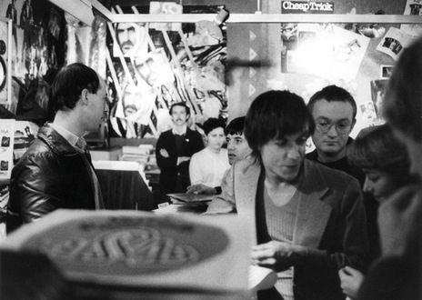 Iggy Pop at Taste Records, Auckland, 1979. David Herkt to Iggy's left. At the back wall, designer Terence Hogan (AK79, Class of 81, Toy Love etc.) Behind the counter is Simon Grigg