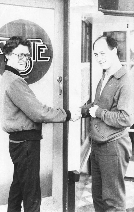 Simon Grigg, at right, ceremonially handing over the keys to the Parnell Taste Records store (the former Professor Longhair's) at 279 Parnell Road, to new manager Robert Nicholson in 1979