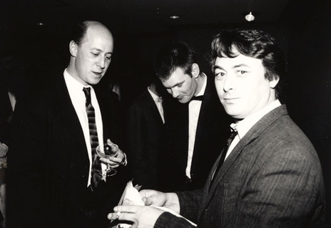 Simon Grigg, Roger Shepherd and Doug Hood at the Apra Silver Scroll. Photograph taken at the Powerstation, Auckland, in the late 1980s by Murray Cammick