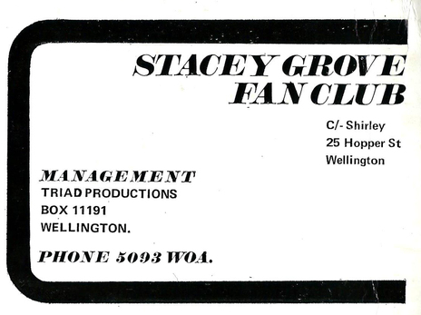The Stacey Grove fan club card. Triad Productions was manager Robin Robinson's company.