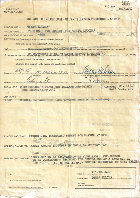 A typical TVNZ contract for a band performance in the early 1980s, this one being for Dropa Kulcha, an early evening show. This was for two numbers, the second of which was never recorded as the show was cancelled.