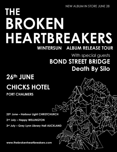 The Broken Heartbreakers are the result of years of consistent musical work by the group’s songwriters, John Guy Howell and Rachel Bailey. The now-Dunedin based band has evolved to reveal a unique sound that references classic and retro influences while keeping a clear and unsentimental eye on the 21st Century world.