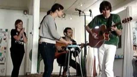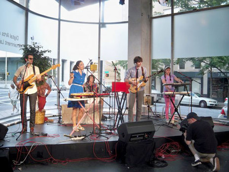 A radio station recording session in Atlanta, with the final Brunettes lineup - Andrew Thompson, Heather Mansfield, John Parker, Jonathan Bree and Chelsea Nikkel