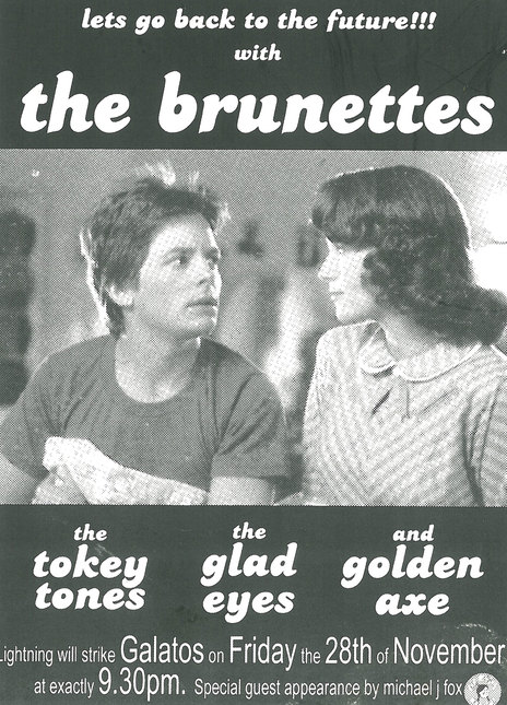 A flyer for The Brunettes' 2003 Back To The Future show, which included Jonathan pretending to hurt his hand and being replaced by Liam Finn, as in the movie