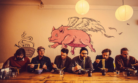 The Phoenix Foundation in The Ramen Shop, Newtown, Wellington, 2015: L-R, Luke Buda, Conrad Wedde, Tom Callwood, Samuel Scott, Chris O'Connor and Will Ricketts.