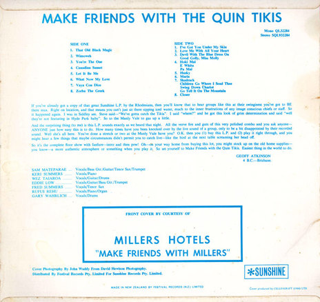 1967 was a busy time for The Quin Tikis. They released their debut album, Make Friends With The Quin Tikis, through Sunshine Records. They also took part in the Miss New Zealand Tour and performed on the Miller circuit across Sydney and the Pacific. By the year’s end, Rufus decided to pack up his young family and move back to New Zealand. Once there, he was invited to join The Quincy Conserve.
