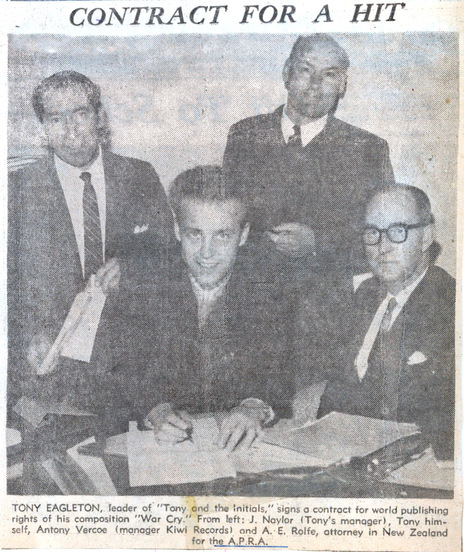Tony Eagleton signs a publishing contract in 1961 for his second single War Cry. Whilst this sold well in New Zealand there is no indication it was ever a global contender.